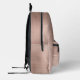 This personalised backpack features a monogram and first name in modern black and white script on an elegant rose gold faux brushed metal background.