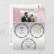 The embossed silver floral holds information you wish to convey at that time. A unique gold and glitter number and a row of wavy white pearls behind the custom photo add chic to the final design.