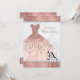 This trendy rose gold quinceañera invitation features a glittering dress in rose gold with glitter heels between a diamond border and sparkling rose gold band. Background is a soft white silk. Back features diamond and rose gold sparkling borders along the top and bottom. Elegant script in dark grey for party details. Easy to personalise with custom options.