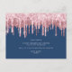 This modern invitation design features faux pink rose gold dripping glitter, navy blue background and elegant calligraphy font.