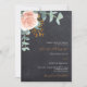 Chalkboard background. Decorated with a rose gold and blush pink floral, rose flower and green watercolored eucalyptus leaves, sprigs, greenery and a faux gold sprig. Personalise and add your names and details. White and golden coloured text.