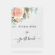 Transparent background. Decorated with a large rose gold, blush pink rose and eucalyptus greenery. Text: Please sign the guest book.