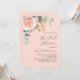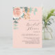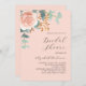 A trendy peach coloured background. Decorated with a rose gold and blush pink floral, rose flower and green watercolored eucalyptus leaves, sprigs, greenery and a faux gold sprig. Personalise and add the name of the bride to be and party details.