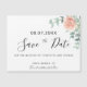 A modern Save the Date magnet card for a wedding. A chic white background decorated with green watercolored eucalyptus greenery, leaves and sprigs and a rose gold coloured rose, flower floral. Personalise and add your names, the date and place of the venue. Black coloured letters. The text: Save the Date is written with a large trendy hand lettered style script.