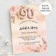 A rose gold, blush pink gradient background. Decorated with rose gold and pink florals, roses, pampas grass. Personalise and add a name and party details. Number 90 is written with a balloon style font.