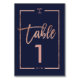rose Gold typography on customizable navy blue rose gold half frame, and faux rose gold geometric stripes chic table number wedding , perfect for elegant, beach wedding,