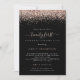 Rose Gold Glitter 21st Birthday Black Invitation. A border of rose gold glitter is at the top on each side, and Twenty First is in an elegant script with swashes, on a classy black background. Easily personalise the text to your own details.