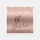 Chic 60th birthday party napkins featuring "60 & Fabulous" in an elegant calligraphy script, a rose gold background and rose gold faux glitter. Personalise with her name and the date of the party.