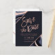 rose Gold typography on customisable navy blue rose gold glitter geode agate marble, and faux rose gold geometric stripes chic save the date wedding , perfect for elegant, stylish wedding,