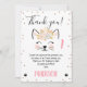Sweet kitten face themed birthday thank you card in pink, faux rose gold glitter and black. This design features a hand drawn kitten's face and floral arrangement in various shades of pink and faux rose gold glitter. This is a sweet way to thank guests for coming to your little girls birthday party.