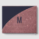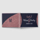 Elegant, chic, and modern faux printed rose gold glitter and rose gold foil circular colour block cutout on navy blue and faux rose gold brush script text, wedding guestbook. This classic and sophisticated design is perfect for the trendy and stylish marrying couple. Personalise with your own message on the front as well as a customised monogram initial on the back. All photo print design.