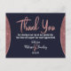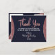 Elegant, chic, and modern faux printed rose gold glitter and rose gold foil circular colour block cutout on navy blue and faux rose gold brush script text, Thank You Postcards. This classic and sophisticated design is perfect for any stylish and trendy event, including weddings and everyday occasions. All photo print.