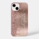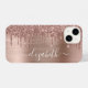 Custom elegant and girly iPhone case featuring dripping rose gold faux glitter on a rose gold faux brushed metallic background. Personalise with your name in a stylish trendy white script with swashes.