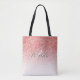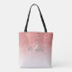 This tote bag features a faux rose gold glitter ombre design with modern script text. Personalise it with your name and initial.