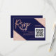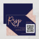 Rose Gold typography on customisable navy blue rose gold glitter colour block, and faux rose gold geometric stripes chic rsvp wedding with your qr code , perfect for elegant, stylish wedding,