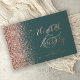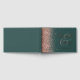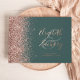 This elegant wedding guest book features a rose gold faux glitter border on a dark emerald green background. Easily customise the real rose gold foil text, with the names of the couple in whimsical handwriting calligraphy over a large ampersand. Add additional text of your choice to the front and spine.