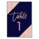 rose Gold typography on customisable navy blue rose gold glitter colour block, and faux rose gold geometric stripes chic table number wedding , perfect for elegant, beach wedding,