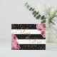 Pink roses over black and white background with gold glitter-effect confetti modern floral save the date postcard.