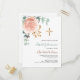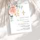 Rose gold and blush pink florals, eucalyptus greenery and a golden cross. Personalise and add a name and details.