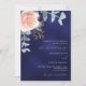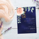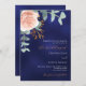 A navy blue coloured background. The blue colour is uneven. Decorated with a rose gold and blush pink floral, rose flower and green watercolored eucalyptus leaves, sprigs, greenery and a faux gold sprig. Personalise and add your names and details. White and golden coloured text.