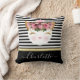 Rose gold kitty princess monogram pillow. Pretty cat princess face in rose gold, blush pink and gold glitter, pink heart shaped nose and big golden glitter eye lashes, with a crown and pink and red roses floral arrangement. Black and white lines striped background with golden ribbon. Easily customise and add your name to personalise the pillow.