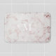 Custom-designed bath mat featuring personalized monogram on modern stylish rose gold and pink marble pattern design.