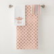 Chic bath towel set done in rose gold and white featuring stripes, on the bath towel and polka dots, on the wash cloth. The hand towel is done in white with a rose gold crown, at the bottom with custom coral coloured text reading Hers. Personalise the text to read what you want. Great gift idea for weddings and new home owners.