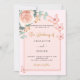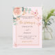 A blush pink background with a rose gold and peach coloured arch. Decorated with a rose gold and blush pink floral, rose flower, green watercolored eucalyptus greenery and butterflies. Personalise and add your names and details.