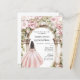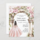 A large marble arch decorated with pink florals. A girl with a rose gold dress. Personalise and add a name and details.
