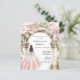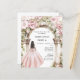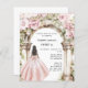 A large marble arch decorated with pink florals. A girl with a rose gold dress. Personalise and add a name and details.
