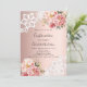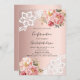 An elegant Confirmation invitation. A rose gold gradient background decorated with pink and rose gold florals, roses, lace and a golden cross. Personalise and add a name and details.