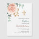 Rose gold and blush pink florals, eucalyptus greenery and a golden cross. Personalise and add a name and details.