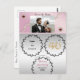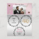 The embossed silver floral holds information you wish to convey at that time. A unique gold and glitter number and a row of wavy white pearls behind the custom photo add chic to the final design.