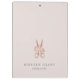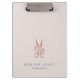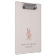 Chic personalised clipboard for your salon or hairstyling business features two lines of custom text in classic grey lettering, on a pale blush pink background adorned with a pair of flower-embellished scissors in faux rose gold foil. Design repeats on reverse side.