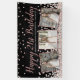 Elegant custom birthday banner design featuring rose gold and silver confetti over a black background, modern script typography with the words "Happy 21st Birthday" (in rose gold), your name and birth date (in silver) and three of your favourite photos framed in metallic rose gold foil.