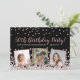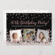 Elegant custom birthday party invitation design featuring rose gold and silver confetti over a black background, modern script typography with the words "50th Birthday Party" (in rose gold), your name and birth date (in silver) and three of your favourite photos framed in metallic rose gold foil. Personalise it with your party details on the back of the invitation.