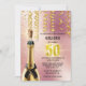 A modern faux gold on blush rose gold design featuring a faux gold bottle of sparkling wine with an exploding cork; sparkling gold glitter and vertical hanging streamers next to white text templates that has a large numeral fifty (50) in gold on it. These are ideal for all fiftieth birthday and business celebrations. Personalise the wording to suit your event.