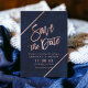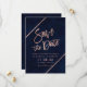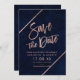 Rose Gold typography on customisable navy blue watercolor and faux rose gold geometric stripes chic save the date wedding , perfect for elegant, stylish wedding,