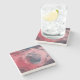The coasters are gorgeous, a quality feel and heavy weight. They look like a precious archeological find. A rustic stone juxtaposed with a modern floral black and white print. I like the way the print goes slightly imperfect on the cut stone edges giving them a kind-of natural beauty.