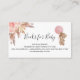 A bring a book request, ticket insert for a baby shower. A white background. Decorated with rose gold, blush pink florals, pampas grass, and a teddy bear holding a balloon.