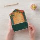 The innovative feature of this invitation lies in the tear-off RSVP card discreetly placed at the bottom inside. The tear-off card serves as a postcard, making it convenient for guests to respond. Options for "Accepts Invitation" and "Decline" are provided, allowing guests to easily indicate their attendance plans. The tear-off postcard is pre-addressed and ready to be sent back, streamlining the RSVP process for both hosts and guests.