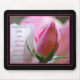 A beautiful pink rosebud with soft pink and white in the background accents the scripture 1 Corinthians 13:13. Faith, Hope, and Love is the message of this inspirational mousepad. Design has a thick black border with pink pinstripe inside border.