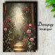 This enchanting composition guides the viewer along ancient stone steps through a rose-laden woodland passage. The artwork masterfully combines architectural and natural elements, with weathered stone steps ascending into a golden-lit mystery, framed by exquisitely detailed coral roses and rich emerald foliage.