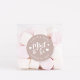 Punny wedding favour stickers feature "mint to be" in white hand lettered script accented with hearts, on a dusty rose pink taupe background. Personalise with your names and wedding date.