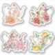 This 4-sticker pack features watercolor illustrations of rose teapots in orange, red, pink, and yellow, all with rose embellishments.