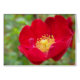 A macro photograph of a bright red single-petal miniature rose with a sunny yellow centre.