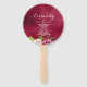 A bright, bold floral of roses in shades of burgundy and cream is the focal point for many of the pieces of this wedding suite that also features elegant script text and modern design layouts. The wedding hand fan shown here has a side border of roses and a beautiful watercolor abstract on the reverse in rich burgundy and plum. Easily enter your personal message and wedding ceremony details using the provided template. Search ID584 to see all the matching pieces in this beautiful wedding set.