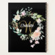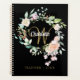 Pretty monogram 2023 planner, featuring a beautiful white script name with a complimenting gold initial that is framed by a delicate watercolor floral rose garland on a black background. Designed by Thisisnotme©