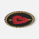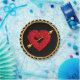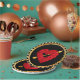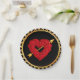 Paper party plates with a heart made of roses with a golden arrow of love shot thru it. The background is black with golden trim around the edges.