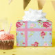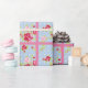 A pretty wrapping paper with roses on blue with white polka dots and a matching pink background.